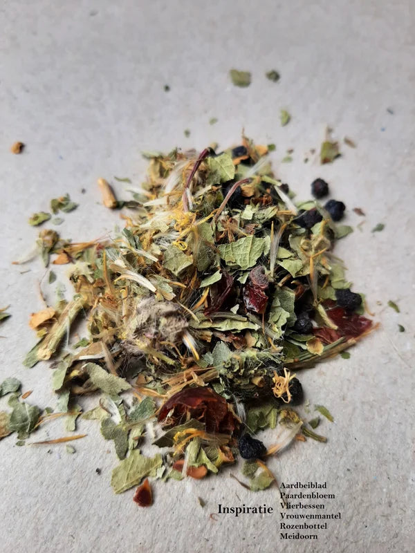 Discover the power of creative inspiration with our enchanting blend "Inspiration Tea." This unique combination of ingredients, including strawberry leaf, elderberry, rosehip, dandelion, lady's mantle, and hawthorn, is specially formulated to stimulate your mind and awaken your creative energy.